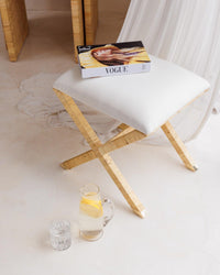 From its iconic X-shaped base to the polished brass caps adorning each leg, the Bali Rattan X-Base Stool exudes a sense of artistry and craftsmanship. Designed with compact dimensions, this stool is perfect for placing at the foot of your bed, tucking beneath an entryway console, or using as extra seating in any room. Handcrafted with a mahogany frame wrapped in natural rattan and topped with a white SR-10 fabric cushion, this stool combines functionality with timeless elegance.