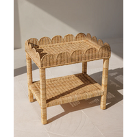 Introducing the Scallop Rattan Side Table, a beautifully crafted piece that combines classic wicker weaving with elegant scalloped edges for a touch of timeless charm. Perfect for sunrooms, bohemian spaces, or any room in your home, this versatile side table is both stylish and functional. Its surface is ideal for holding coffee, plants, or magazines, while the lower shelf provides extra storage for books, decor, or other essentials. Designed to bring a relaxed, artisanal vibe to your space, this table is a must-have for those who appreciate beauty and practicality.